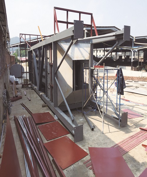 本湿式静电除尘系统按粉尘去除效率≥62.5%、出口粉尘排放浓度≤30 mg/Nm³进行设计。我公司项目部、施工班组、施工机具、工程材料等均已进场,目前正按本项目进度计划有条不紊地开展钢结构部分的制作安装施工,总工期25天,工期紧,雷雨天气多,给施工带来了较大的困难。项目管理人员竭尽全力,合理调配安装工序,力争按合同工期要求保质保量顺利完成本工程的建设。